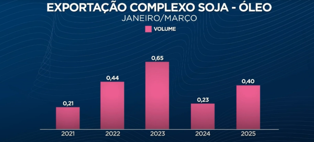 O destaque ficou por conta do óleo de soja, que voltou a ganhar fôlego após uma retração nas vendas em 2024. Esse movimento está diretamente ligado ao cenário internacional, com o chamado “tarifaço” imposto pelos Estados Unidos, uma política tarifária que deve impactar significativamente o comércio bilateral no agronegócio a partir de abril.