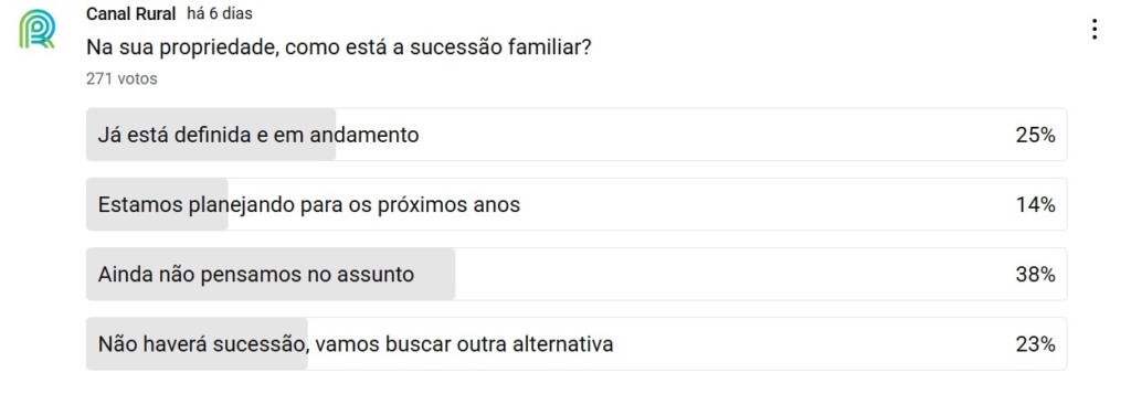 O resultado revelou que 38% dos produtores rurais apontam que ainda não pensam sobre o assunto. Além disso, 25% demonstraram que já está definida e em andamento, 23% afirma que não haverá sucessão e que irao buscar outra alternativa, enquanto 18% planejam para os próximos anos.