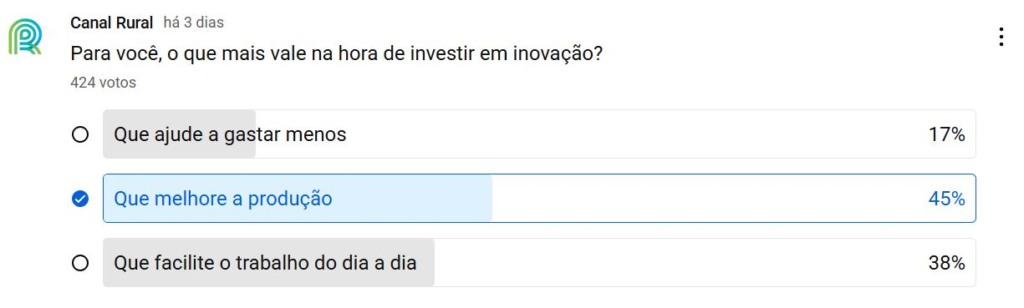 Na interatividade da semana, perguntamos: O que mais vale na hora de investir em inovação? O resultado mostrou que, na hora de investir em novas tecnologias, 45% dos produtores priorizam soluções que aumentem a produção.